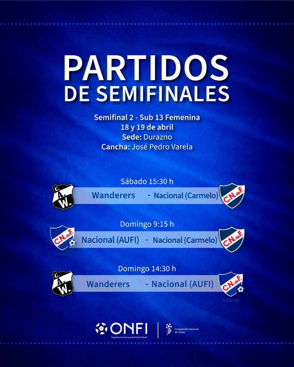 En la categoría femenino Sub 13 nos representa Nacional que juega el Domingo a las 9:15hs versus Nacional de Carmelo; mientras que a las 14:30hs definirá con Wanderers.